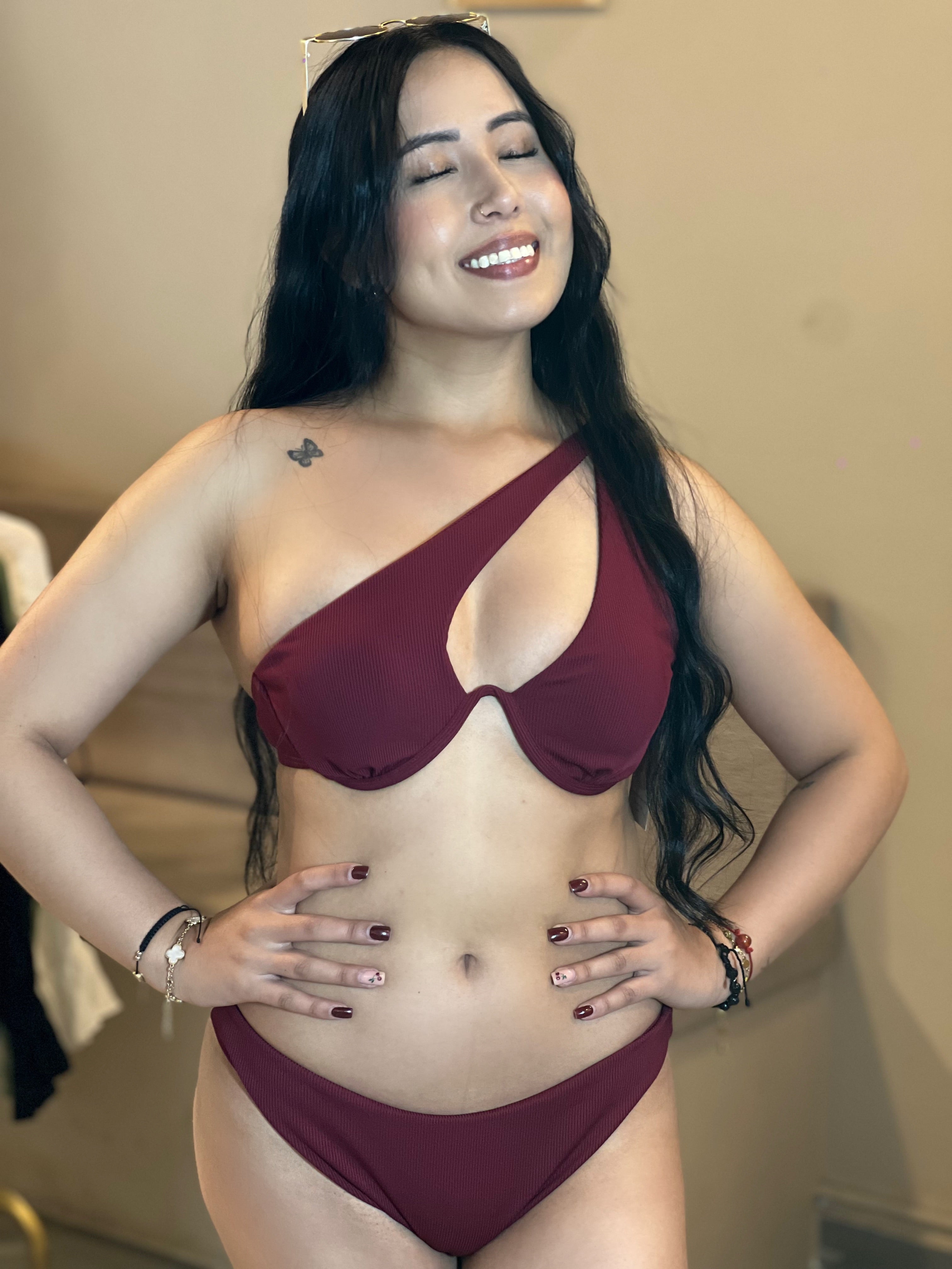 Este bikini de dos piezas en un elegante tono vino es ideal para resaltar tu estilo en la playa o la piscina. El diseño superior asimétrico con un tirante lateral le añade un toque moderno y único, destacando el busto de manera sutil y favorecedora. La parte inferior de corte clásico es cómoda y versátil, perfecta para un ajuste seguro y estilizado. Este conjunto combina sofisticación con modernidad, ideal para quienes buscan algo diferente y llamativo en su look de verano. ¡Listo para tus próximas vacaciones!